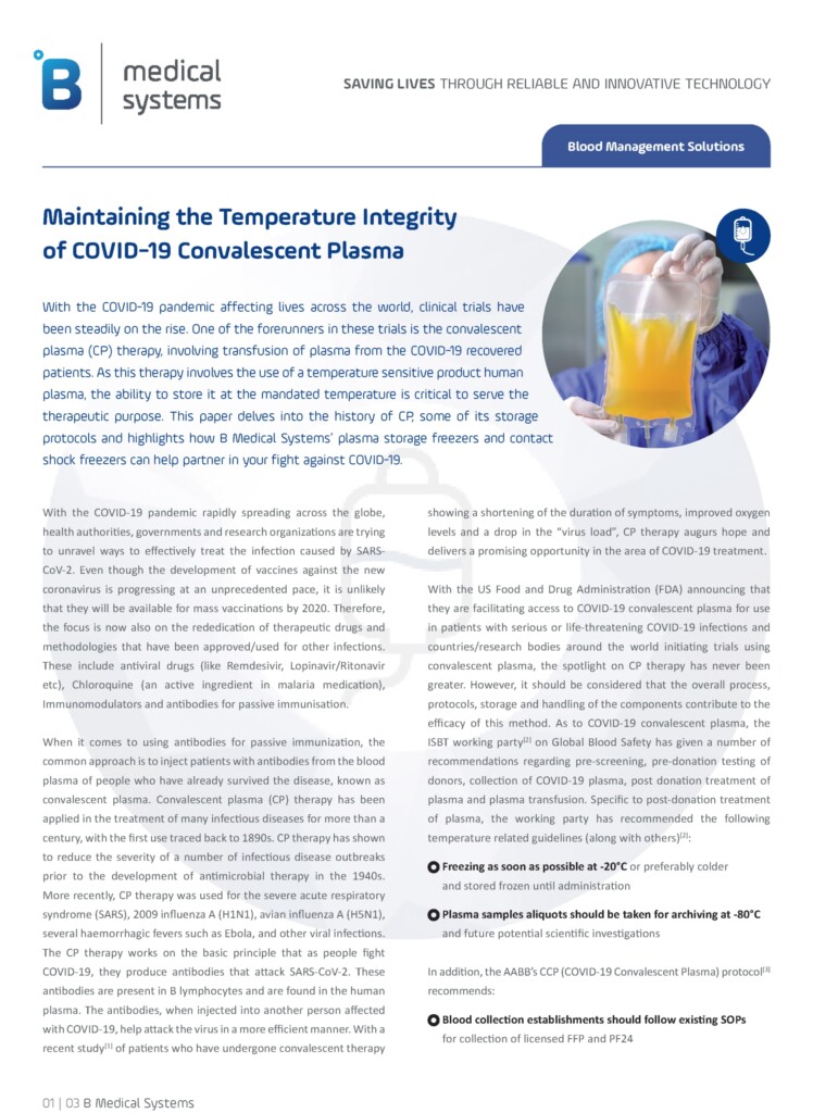 This paper delves into the history of convalescent plasma, some of its storage protocols and highlights how B Medical Systems’ plasma storage freezers and contact shock freezers can help partner in your fight against COVID-19.